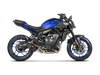 This exhaust has a lightweight carbon-fibre muffler outer sleeve, combined with stainless steel link pipes and headers and finished with a carbon-fibre end cap, to produce a system that is 3.0 kg (41,7%) lighter than stock. The new design features a shorter muffler for an enhanced sporty look, which exits on the side of the bike for visual impact. Power is increased by 1.9 kW (2.6 hp) at 9,100 rpm when compared in back-to-back tests on a MT-07 with a Racing Line (Carbon) exhaust and a standard stock exhaust system. The sporty racing sound is perfectly tuned to the engine. It is designed for use on tracks and closed-course competition circuits.