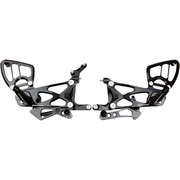 Race-inspired design, All rearsets feature high-grade hardware, folding shift/brake pegs and standard or reverse shift pattern options, Footpeg plate has a small window that shows peg adjustment value and conceals all mounting holes not in use, Made in USA